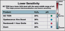 アメリカ国内での商品比較なので、日本では馴染みのない名前もありますが、ご参照ください。GC社の『Tion』が20%と低濃度であるのに対し、オパールエッセンスが38%、レンブラントが35%、ズームが25%と高濃度であり、そのぶん副作用として歯はより沁みにやすくなるということを表わしています。
